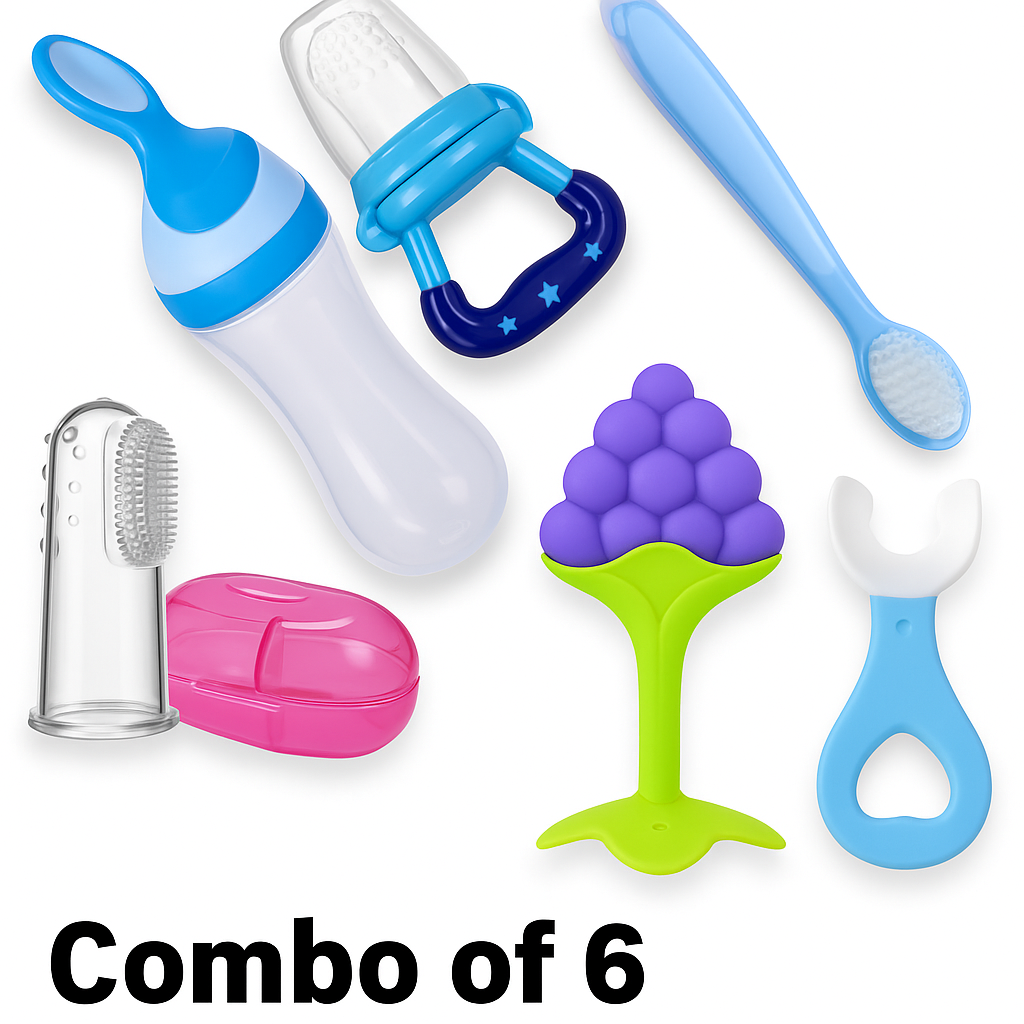 "SproutSpoon Baby Feeding & Teething Set – Fruit Nibbler, Soft Teether, Finger Brush, Spoon Feeder & You-Brush – Multicolor (Pack of 6)"🍼💖